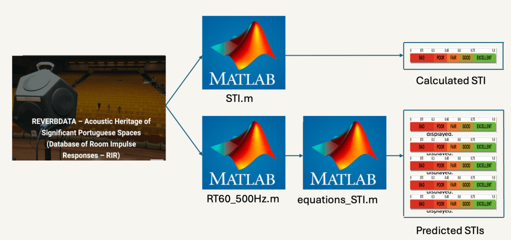 Existing research provides a set of equations to estimate STI using the RT60 at 500 Hz, which perform well in small rooms (<350 m³). I implemented these equations in a custom MATLAB tool: